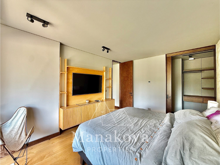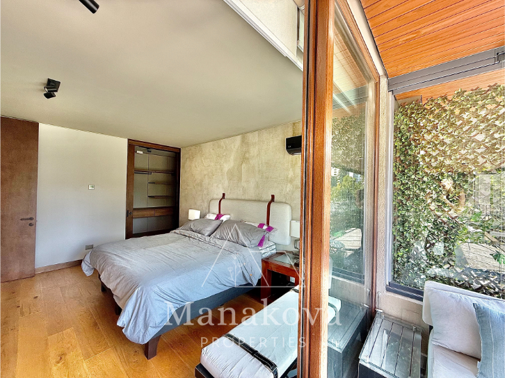 El departamento cuenta con un living-comedor de amplios ventanales, permitiendo la entrada de luz natural y vistas hacia áreas verdes y la ciudad. La cocina de concepto abierto está completamente equipada con electrodomésticos de alta gama, horno empotrado, campana de acero inoxidable y refrigerador Bosch, además de mobiliario moderno y gran capacidad de almacenamiento. El dormitorio principal dispone de cama matrimonial, ventanal con vistas y walk-in closet. Existen dos baños, uno principal con doble lavamanos, ducha con mampara de vidrio y con tina.