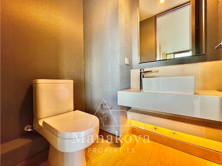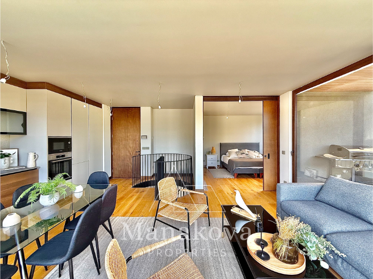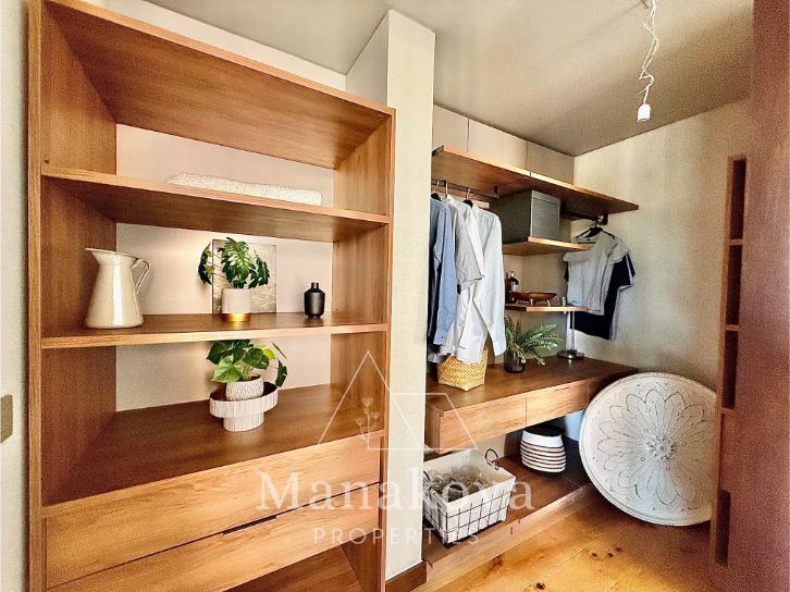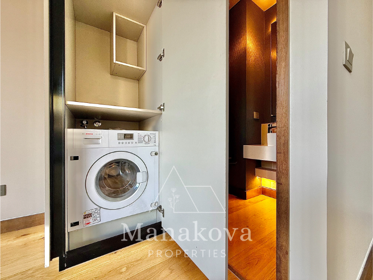 Entre sus características adicionales cuenta con espacio de lavandería con lavadora-secadora integrada, piso de madera natural, y climatización moderna.