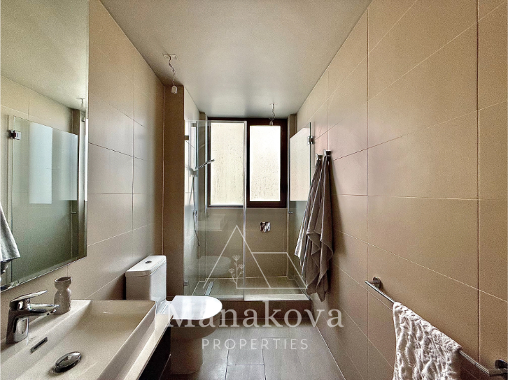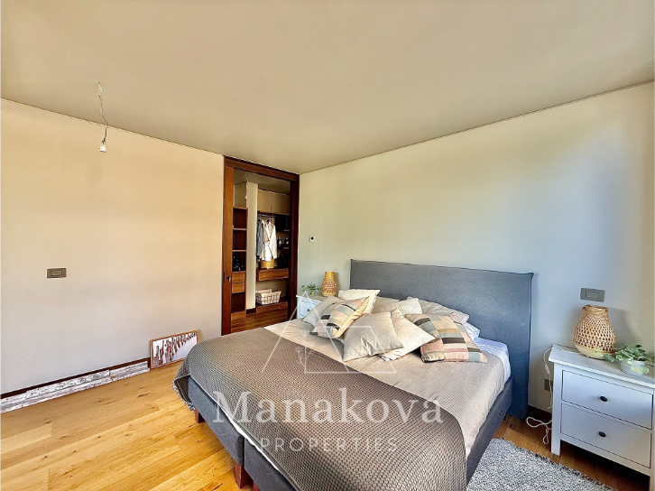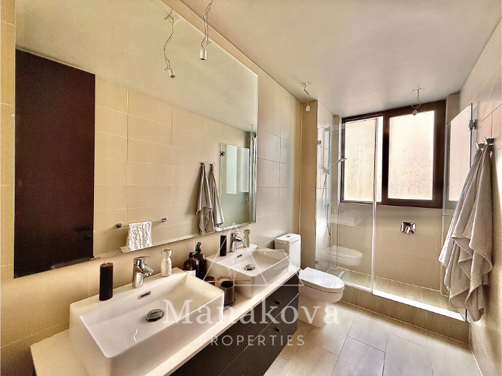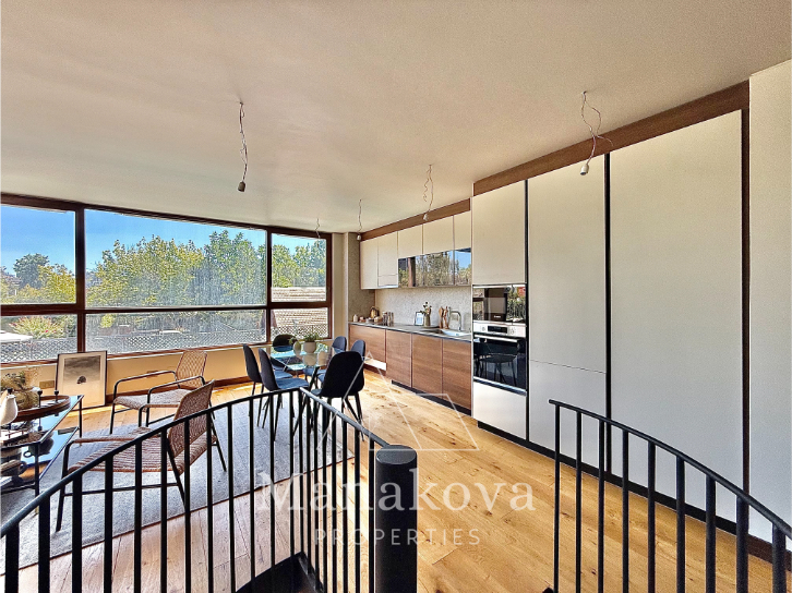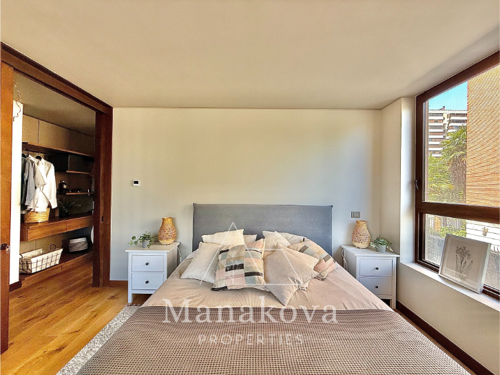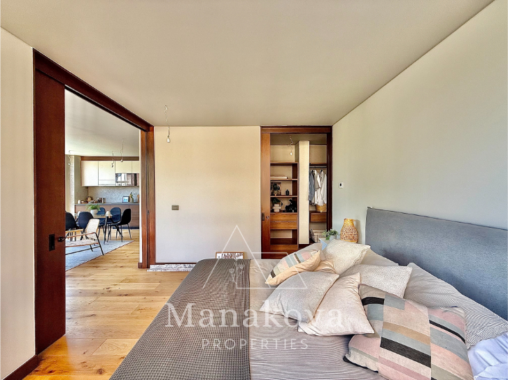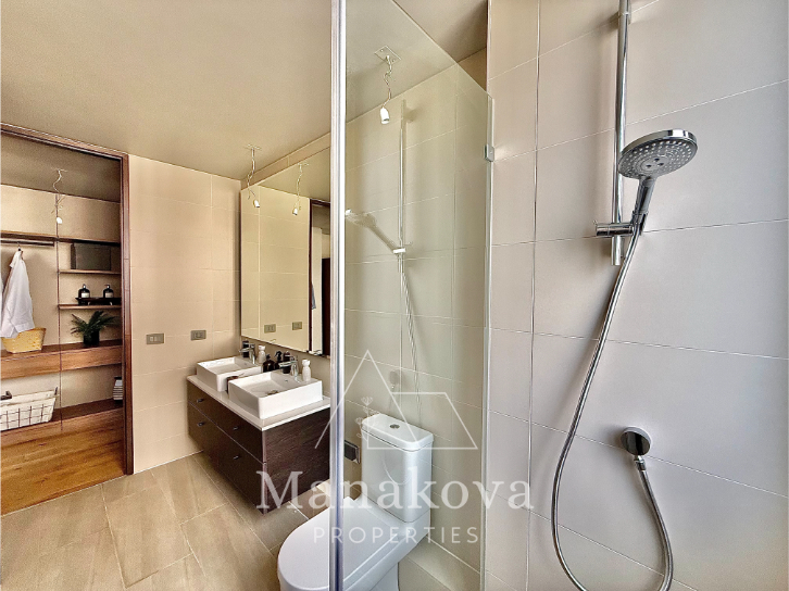 El departamento cuenta con un living-comedor de amplios ventanales con salida a la terraza, permitiendo la entrada de luz natural y vistas hacia áreas verdes y la ciudad. La cocina de concepto abierto está completamente equipada con electrodomésticos de alta gama, horno empotrado, campana de acero inoxidable y refrigerador Bosch, además de mobiliario moderno y gran capacidad de almacenamiento. El dormitorio principal en suite cuenta con walk-in closet, baño completo con ventilación natural. Existen dos baños, uno principal con doble lavamanos, ducha con mampara de vidrio.