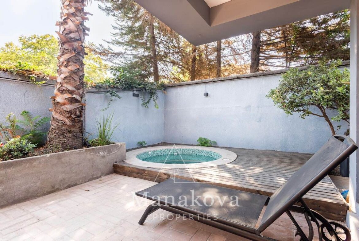 Patio con riego jaccuzi, arbustos, flores y árboles, quincho.