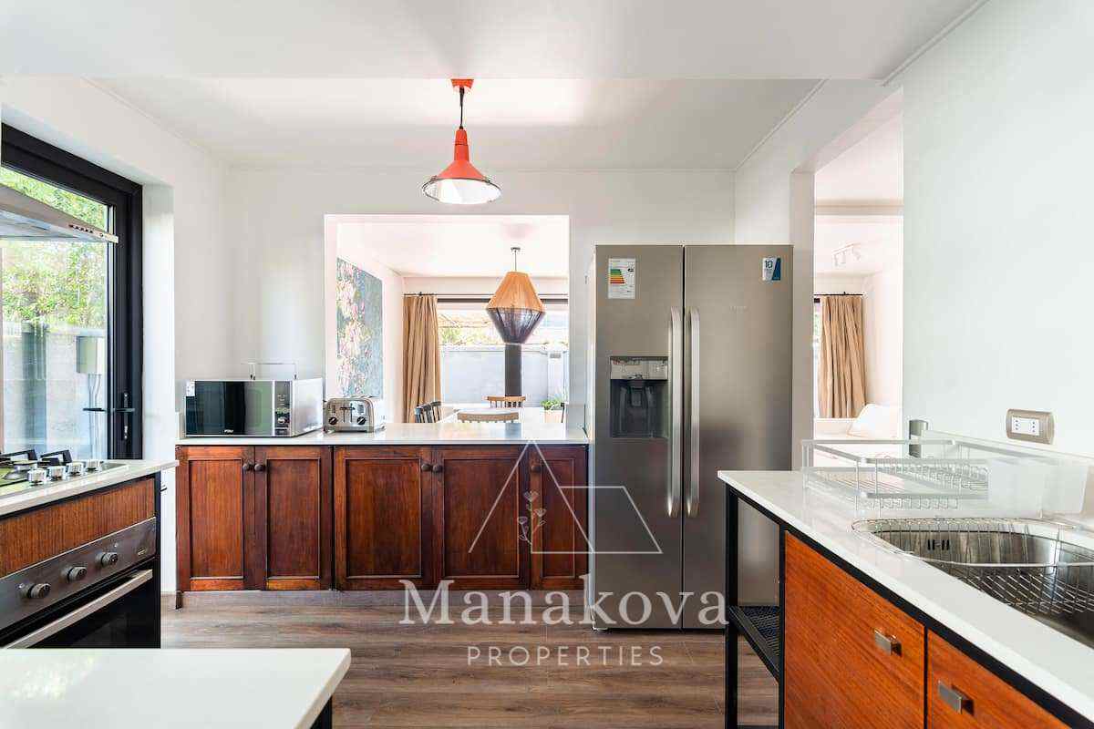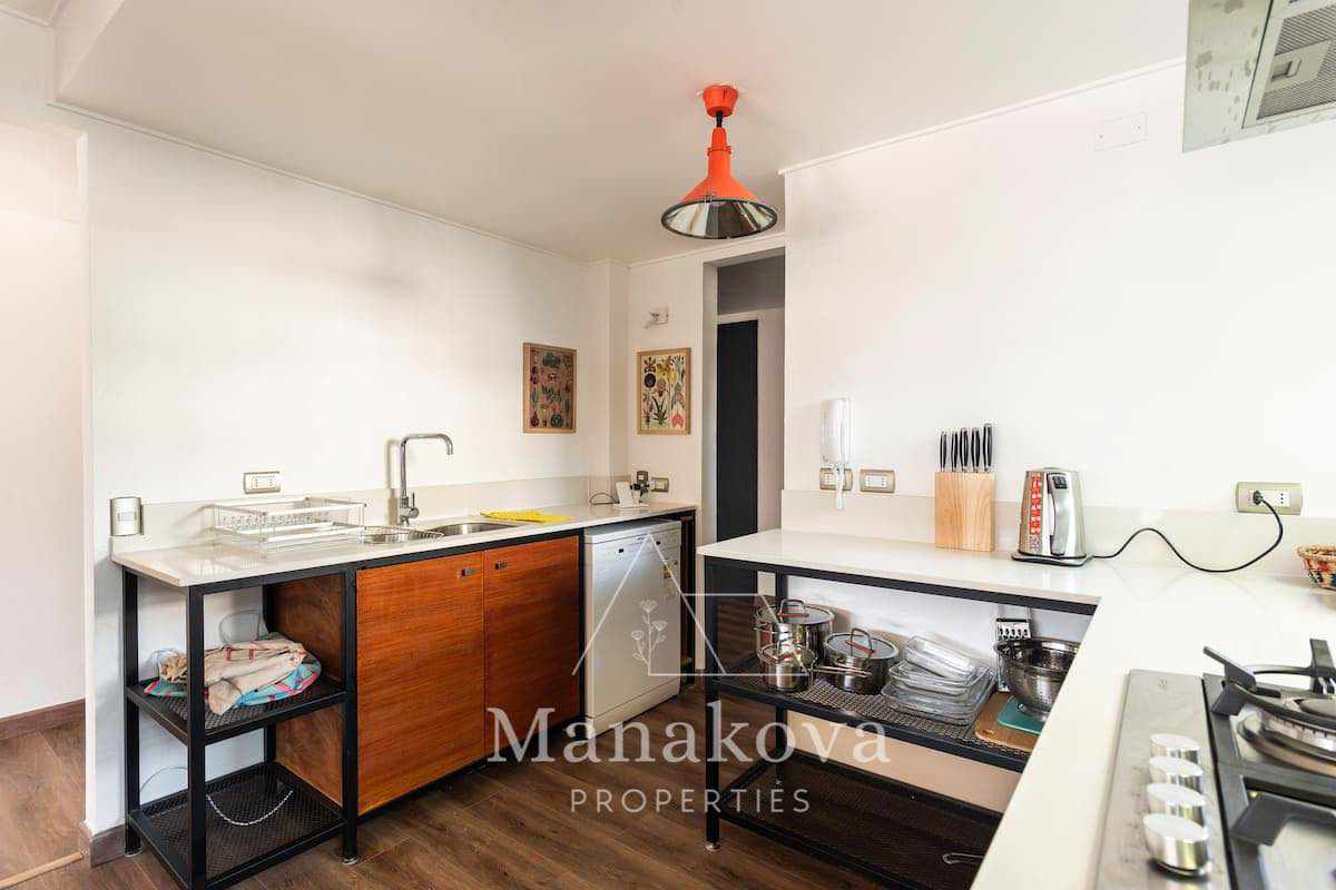 Gran cocina equipada con horno eléctrico, encimera a gas, lavavajillas. Loggia cerrada con conexión para lavadora y secadora.