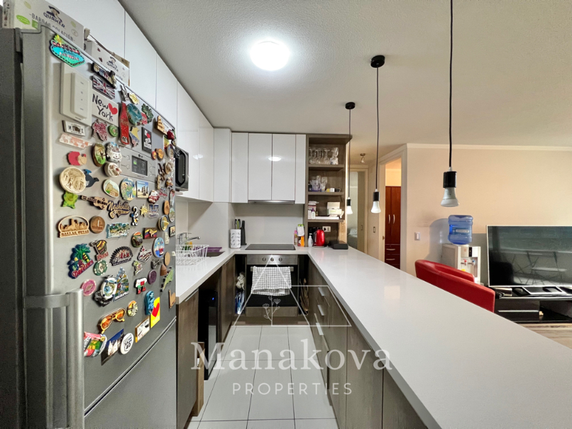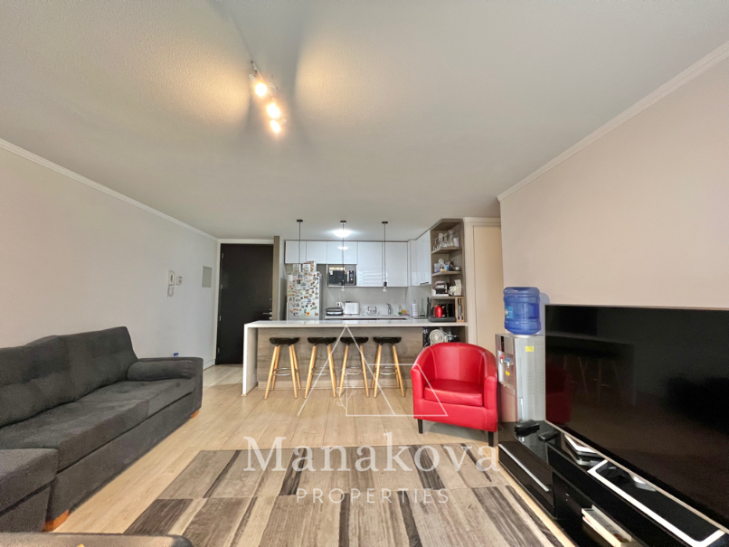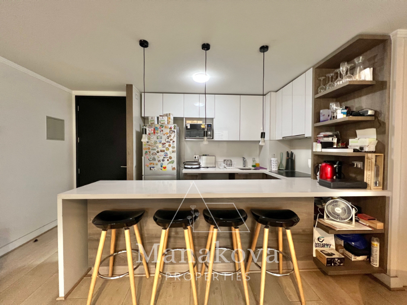 Cocina americana equipada con horno eléctrico, encimera vitroceramica, meson grande. El departamento tiene 2 dormitorios y 2 baños completos, dormitorio principal con un baño en suite y walk in closet. El segundo dormitorio es espacioso y cuenta con un closet en el pasillo. Living comedor con salida a terraza.