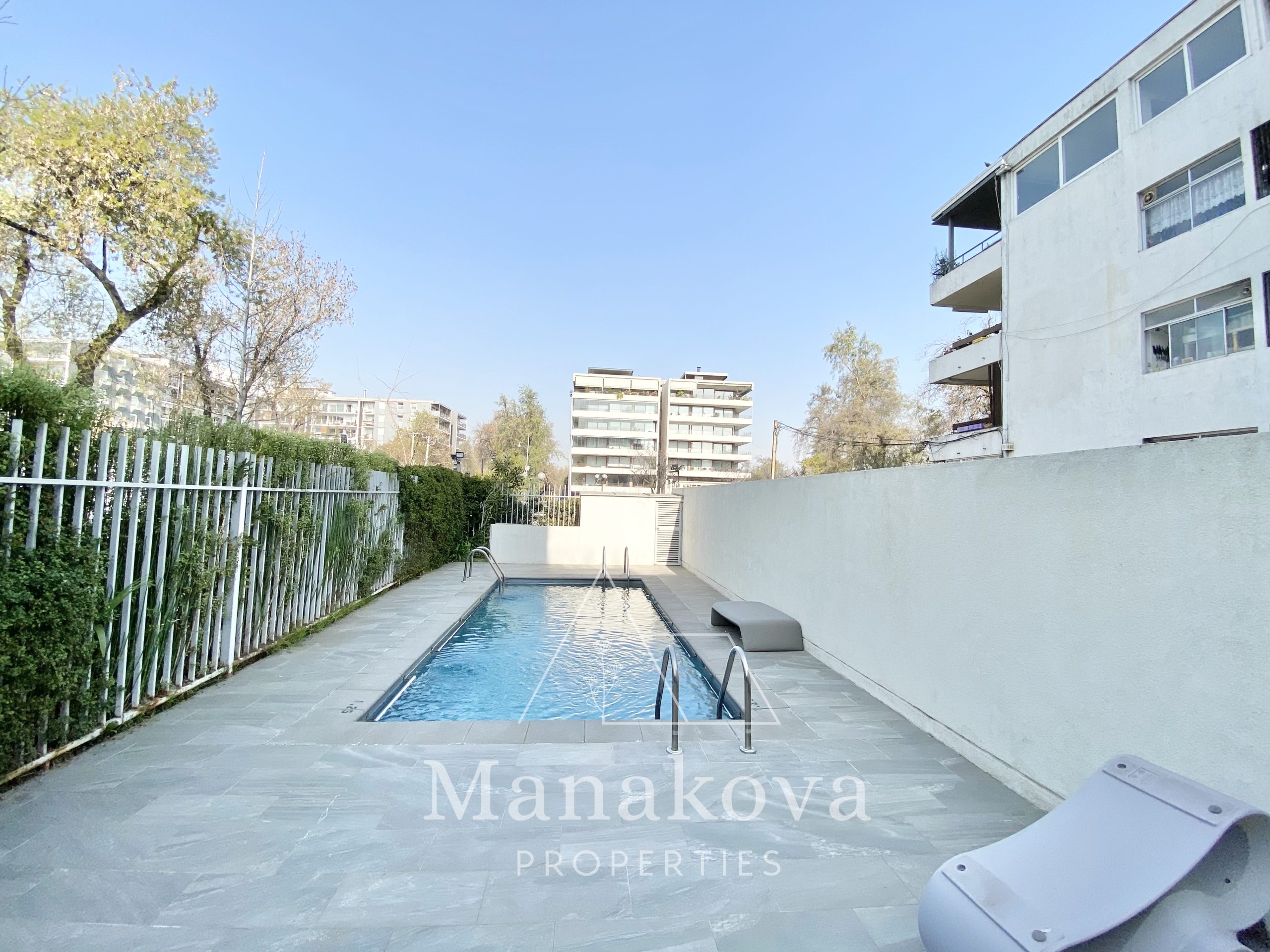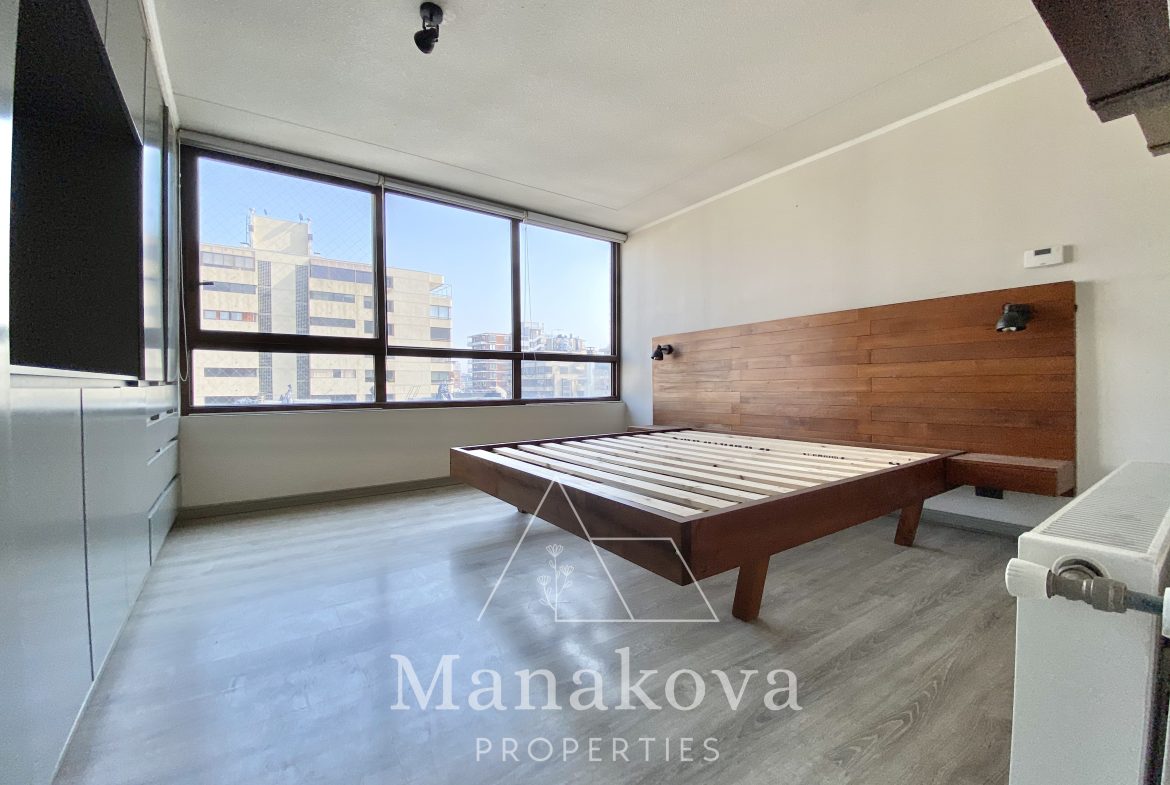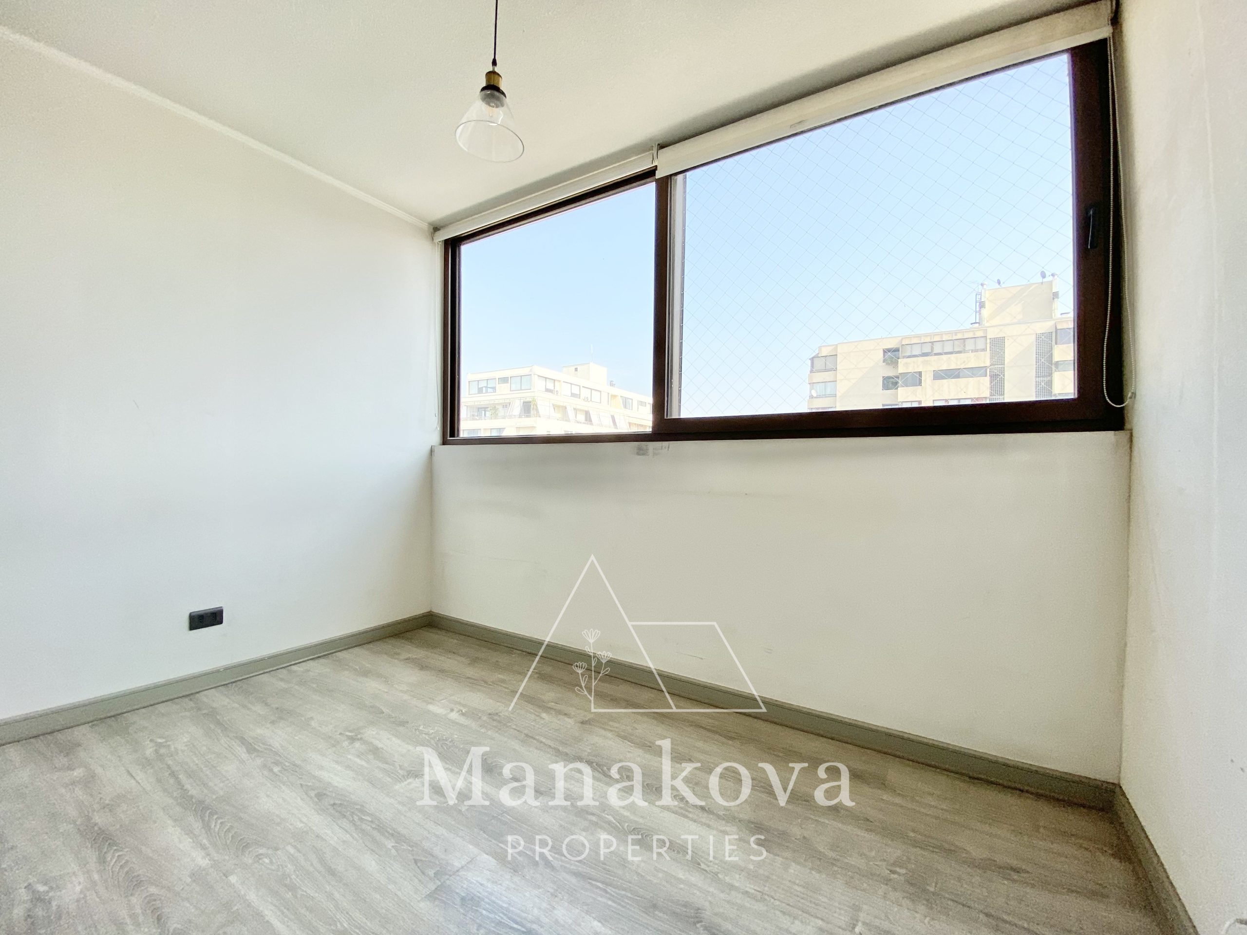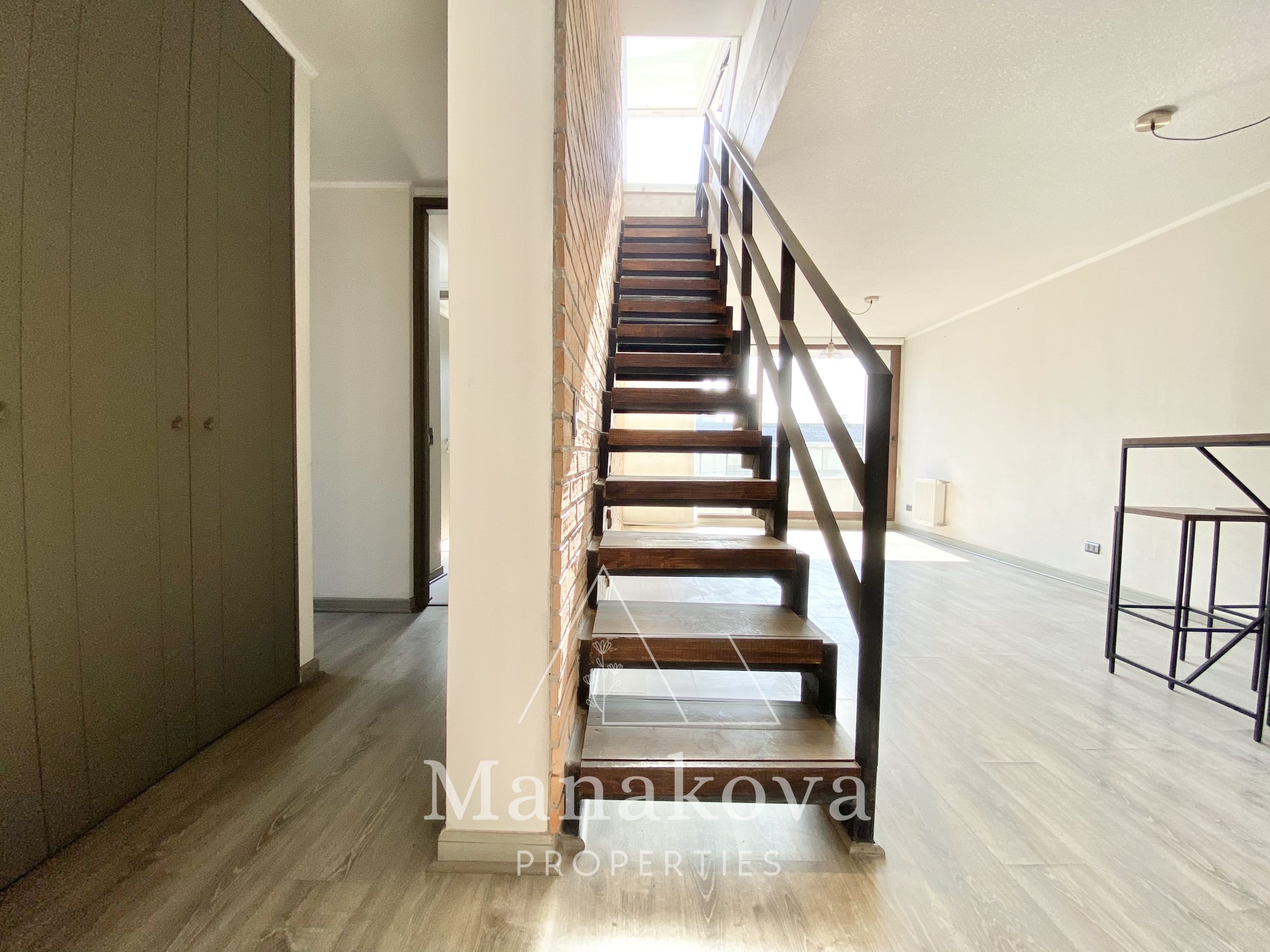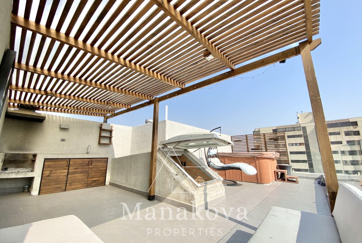 Moderno departamento norponiente Penthouse con una gran terraza Rooptop de 40 m2 que incluye quincho, jacuzzi y muebles a la medida. Dos dormitorios con amplios closets y 2 baños con luz natural. Cocina full equipada con horno, campana, encimera, comedor de diario, conexión para lavavajillas y lavadora, además modernas terminaciones. Ventanas termopanel, incluye cortinas, luces y mesa.