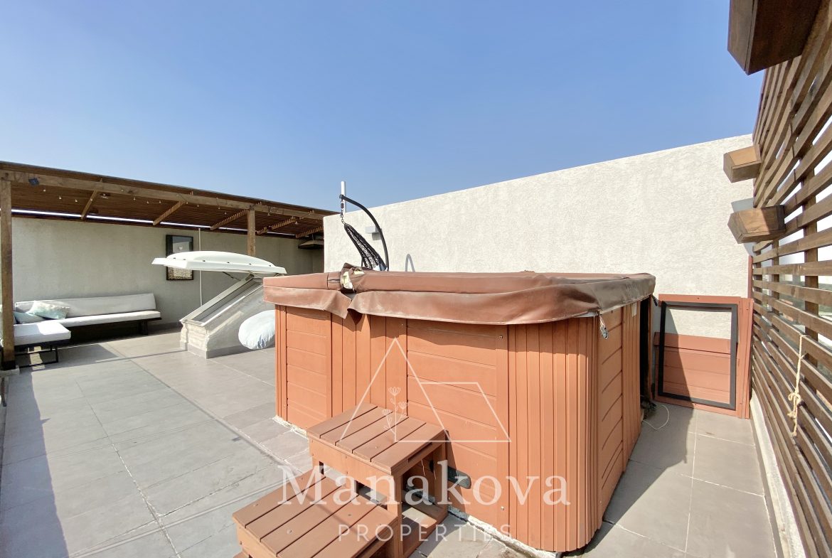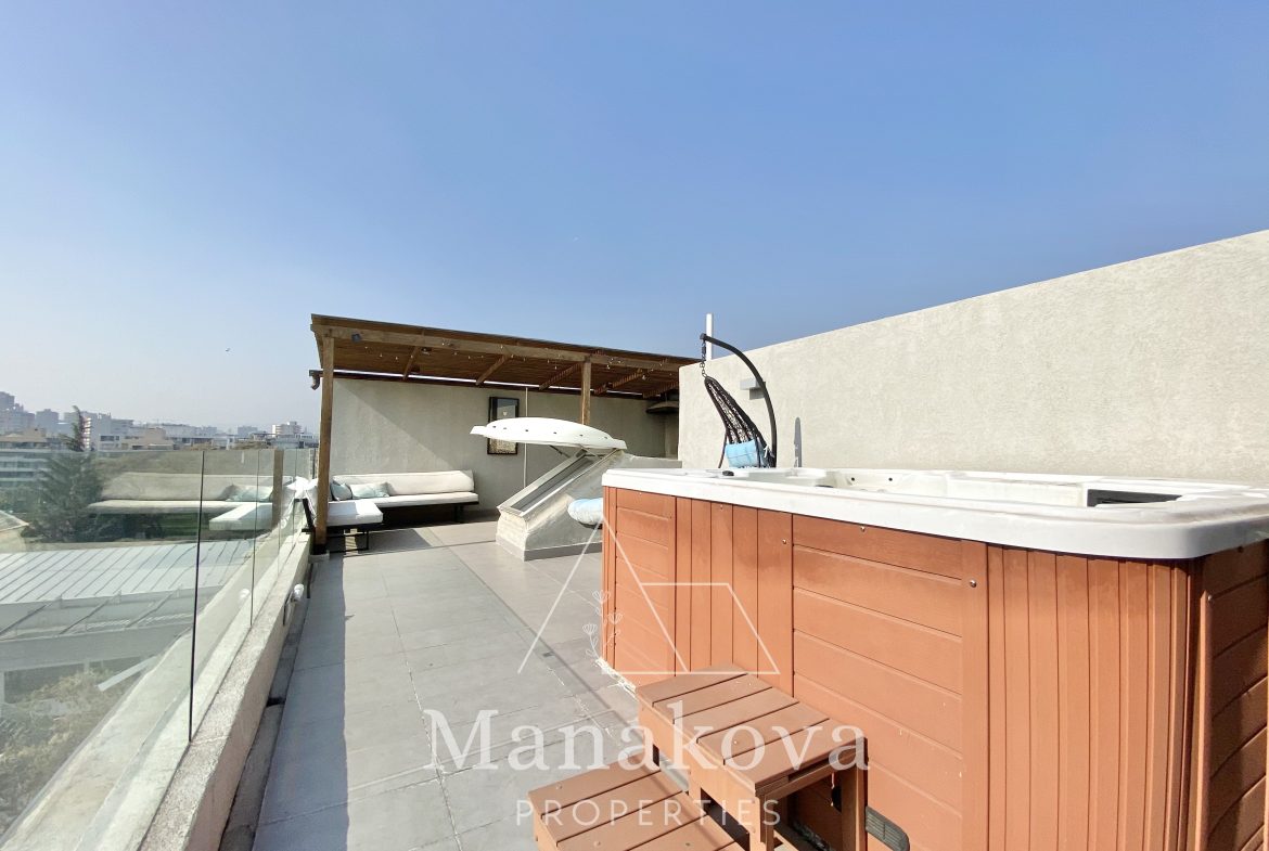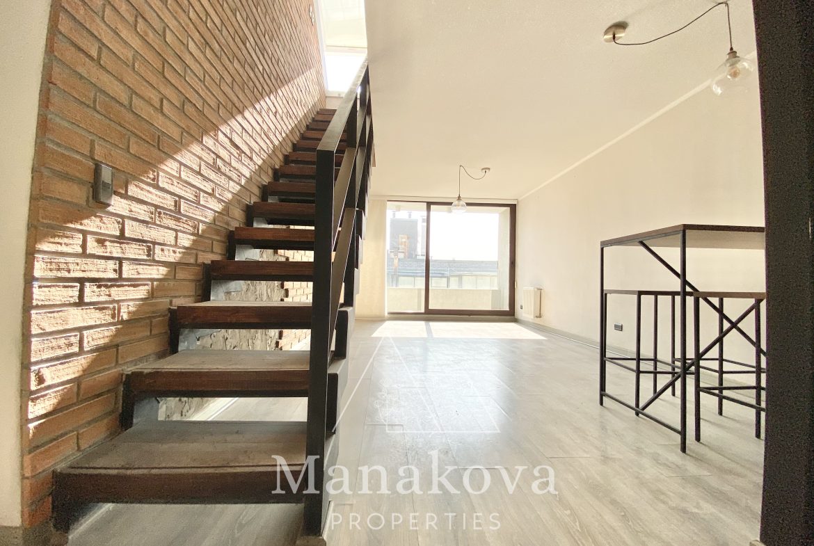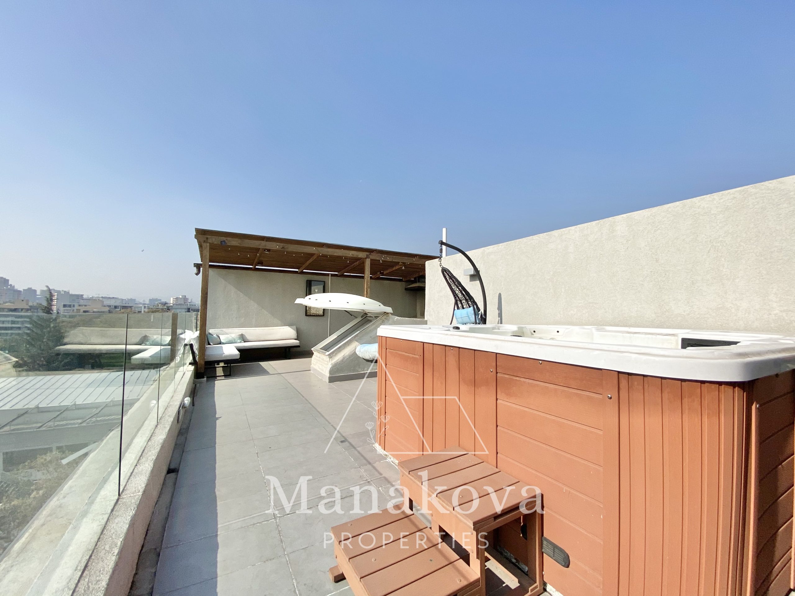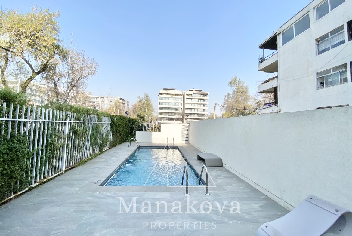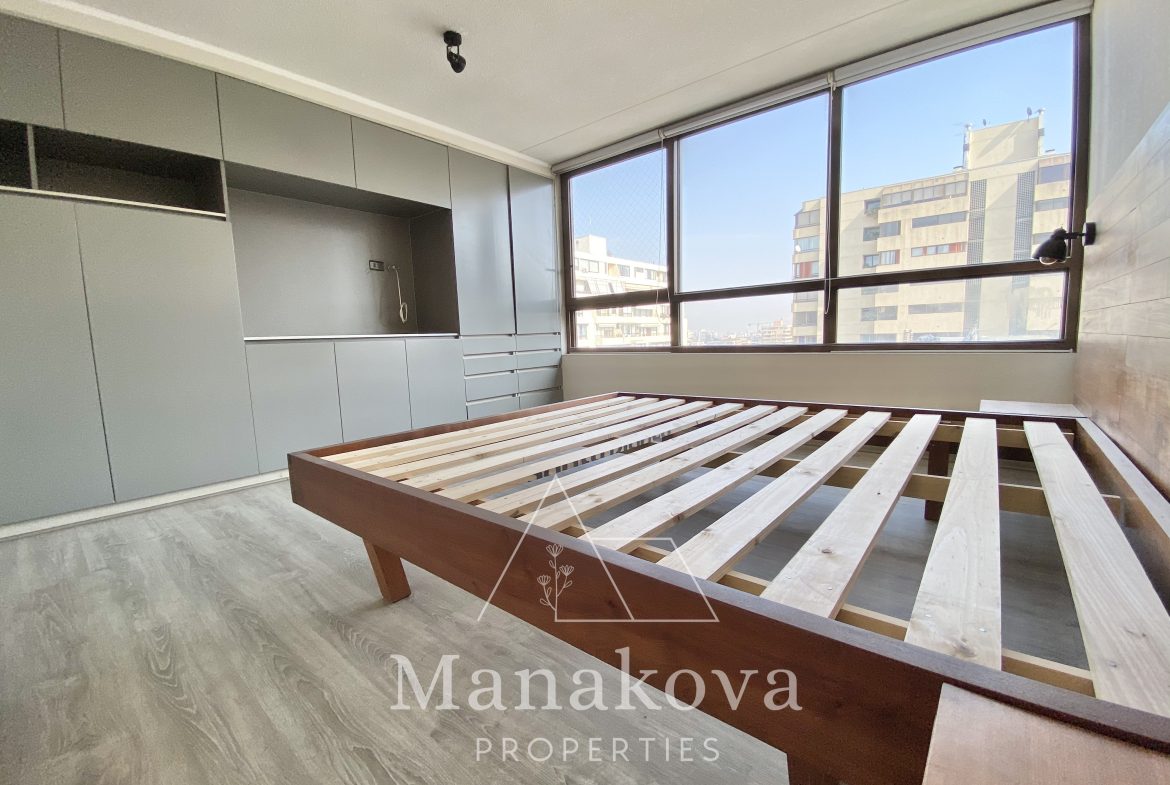 Moderno departamento norponiente Penthouse con una gran terraza Rooptop de 40 m2 que incluye quincho, jacuzzi y muebles a la medida. Dos dormitorios con amplios closets y 2 baños con luz natural. Cocina full equipada con horno, campana, encimera, comedor de diario, conexión para lavavajillas y lavadora, además modernas terminaciones. Ventanas termopanel, incluye cortinas, luces y mesa.