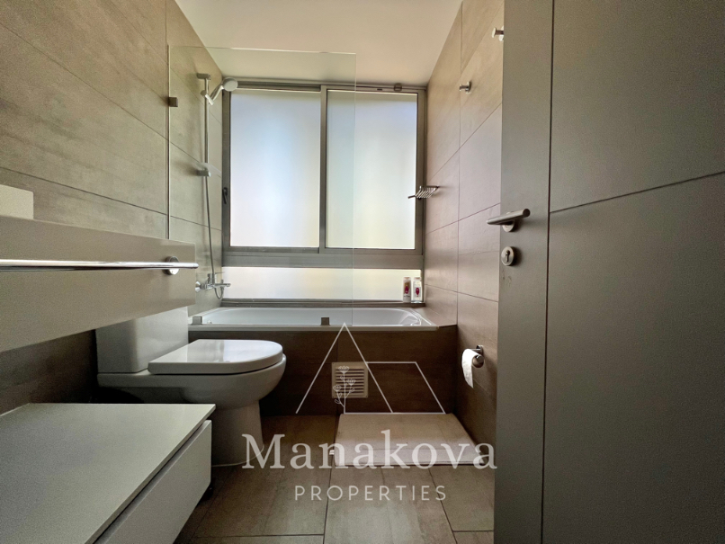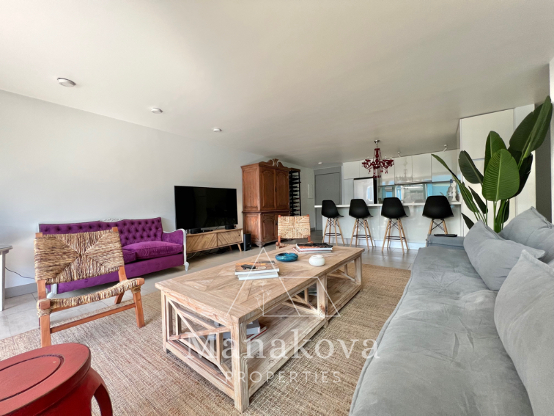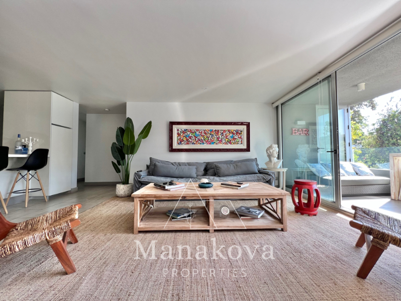 Cocina americana equipada con microondas y horno eléctrico, microonda, meson grande, lleno de cajones. Loggia cerrada con conexion para lavadora.